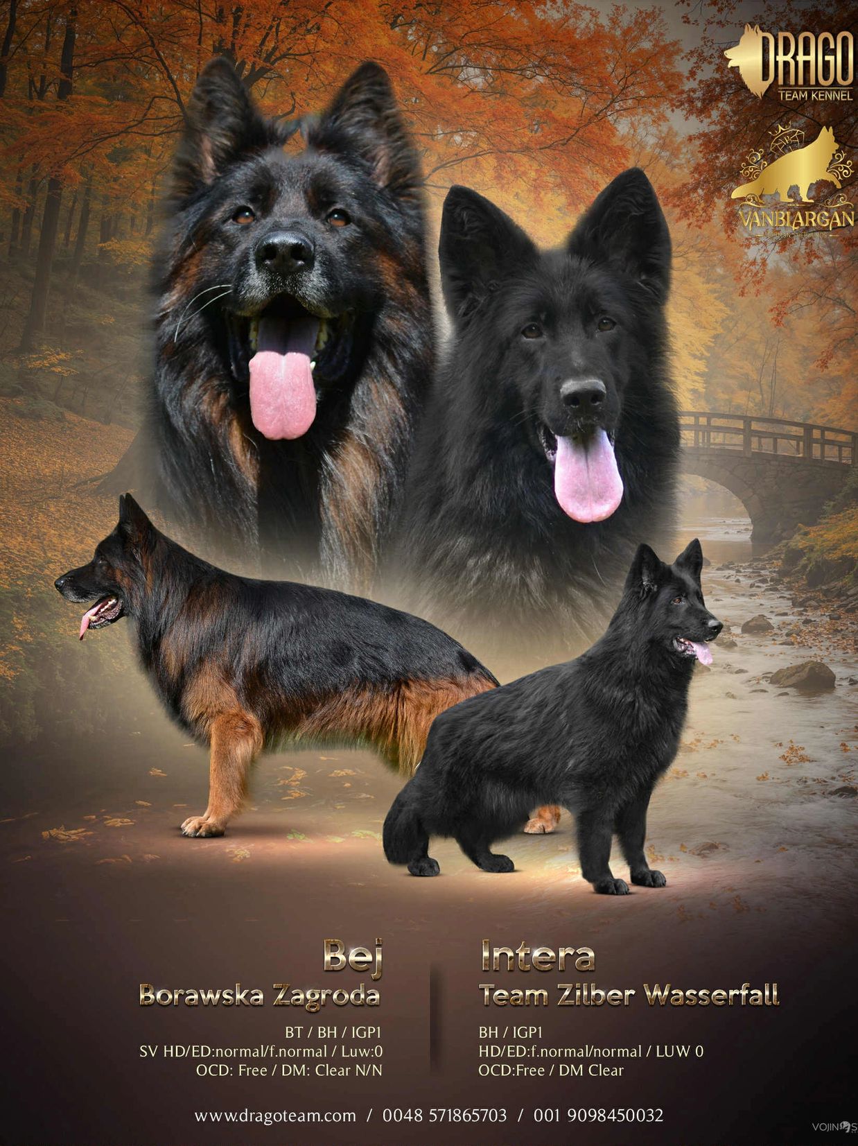 Bej is from Poland and has his BH & IGP1 titles. He is a large male with big bone structure. His coat is extra long & he is extremely majestic looking. He is low/medium drive and his progeny excel as conformation prospects, family companions & service dogs. He is new to our partner kennel and we are beyond excited to be able to bring you his amazing progeny to the United States.